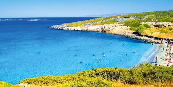A very popular spot for families in July and August, this is the main beach of three in Istron Bay with white sand, clear turquoise waters and great facilities, including kayak and pedalo hire.