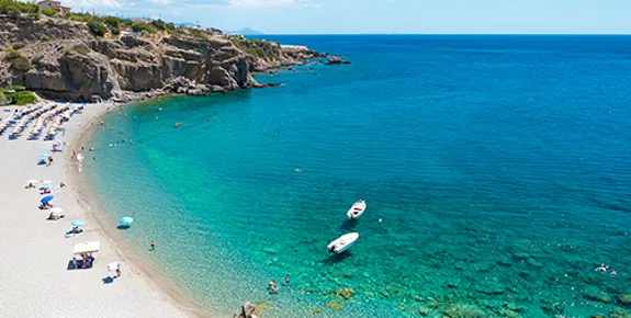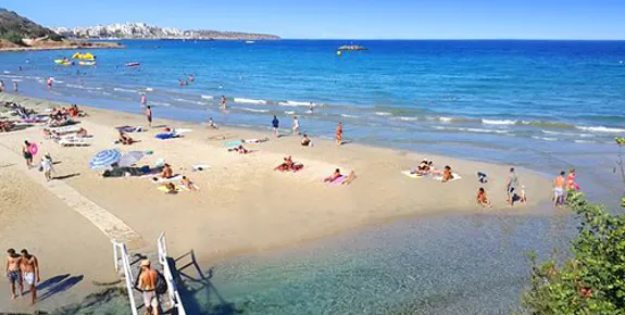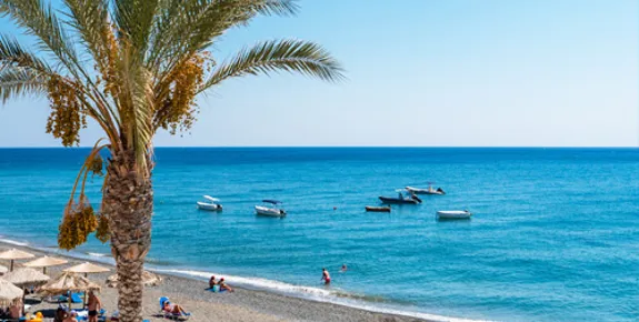 A family-friendly, well organised stretch of sandy coastline backed by hotels and apartments. You’ll find sunbeds and parasols, as well as a harbour area bustling with cafés and fish tavernas.