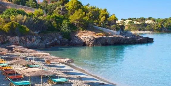 A long, gently shelving and naturally beautiful sandy stretch, perfect for swimming and walking, with sunbeds, parasols and a couple of tavernas. The southern end, Mounda, is a naturist beach.
