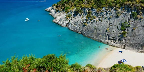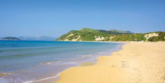 Spanning 2km of gently-shelving golden sand and turquoise sea, Gerakas is part of a protected marine park and nesting ground for loggerhead turtles.
