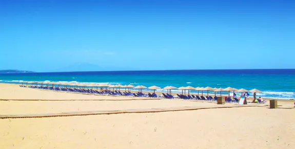 This long, narrow stretch of sandy beach close to the low-key resort of Alykes is fully serviced, with tavernas, cafés and many watersports centres.