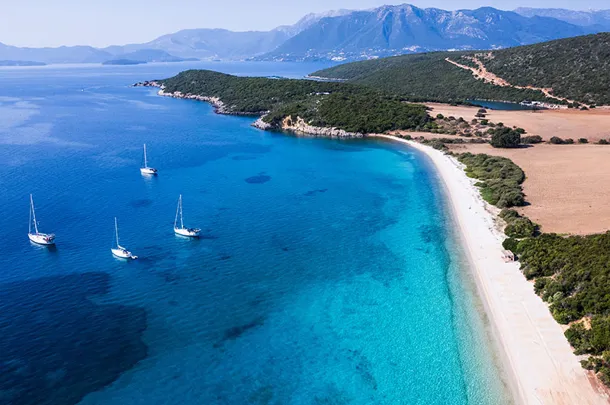 Palairos – a.k.a. Paleros – sits on the water just across the sea from Lefkada, which is easily accessible by road. Book-ended by beautiful beaches and packed with enticing places to eat, this charming little town offers a serene and more authentically Greek escape, where the dazzling blue waters of the Ionian meet the lush, rolling hills of the mainland. Read more >